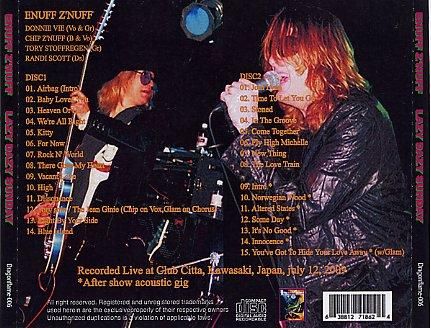 デビュー20周年記念ツアーとして、実に9年振りとなった2009年ジャパン・ツアーより、その最終日となった7月12日川崎クラブ・チッタ公演を、ハイクオリティー・オーディエンス・レコーディングにてコンプリート収録! 130分にも及んだ本編はもちろん、ショー終了後に行われたアフター・パーティで披露された6曲のアコースティック・ナンバーまでを追加収録。 この一夜のプレイを余すところ無く詰め込んだ、まさにファン待望のメモリアル・アイテムで、特にこの日のみ、気の効いたオーディエンスからのリクエストで急遽無造作にプレイされた、しばらく振りの至宝のバラード「Some Day」や「Innocence」は、今も尚色褪せてない超名品。20年に渡るバンドの歴史を総括する、ベスト選曲によるセットリストに、スペシャル・アコースティック・セットも含んだマスト・アイテム。 DISC 1 01. Airbag (Intro) 02. Baby Loves You 03. Heaven Or Hell 04. We're All Right 05. Kitty 06. For Now 07. Rock N' World 08. There Goes My Heart 09. Vacant Love 10. High 11. Dissonance 12. Tory solo / The Jean Ginie (Chip on Vox,Glam on Chorus) 13. Right By Your Side 14. Blue Island DISC 2 01. Joni Lynn 02. Time To Let You Go 03. Stoned04. In The Groove 05. Come Together 06. Fly High Michelle 07. New Thing 08. The Love Train 09. Intro * 10. Norwegian Wood * 11. Altered States * 12. Some Day * 13. It's No Good * 14. Innocence * 15. You've Got To Hide Your Love Away * (w/Glam) Recorded Live at Club Citta,Kawasaki,Japan,july 12,2009 : *After show acoustic gig DONNIE VIE (Vo & Gr) CHIP Z'NUFF (B & Vo) TORY STOFFREGEN (Gr) RANDI SCOTT (Ds) M03