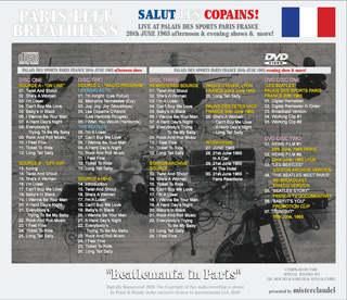 お取り寄せ商品。(ご注文をいただいてから、お取り寄せに3日から1週間お時間をいただきます。) ■ライヴ・クロニクル・シリーズのスペシャル・エディション。 ■かつてないクオリティの音源と映像。 ■豪華スリップケース仕様 マニア必携Mクローデル・レーベルの最新作にして2010年の夏に投入するスペシャル・エディション! いにしえのブート時代から「名演」と誉れの高かった1965年フランス公演のセットが、満を持して遂にライブ・クロニクル・シリーズからリリースされることとなりました。 ビートルズの1965年フランス公演は、イタリア、スペインを含む14日間のヨーロッパ・ツアーの一環として、6月20日のパリ公演(昼夜2公演)、22日のリヨン公演(昼夜2公演)、30日のニース公演と計5回のステージが行われています。5月に映画「Help!」の撮影を終えたビートルズは、MBE勲章の受賞決定、ジョンの二作目となる著書の発表、名曲"Yesterday"のレコーディング…と、充実した活動を行っていた時期で、半年ぶりとなるこのツアーは、前年よりセットリストが刷新され、意気揚々とスタートしたターニング・ポイントでした。 特に初日のパリ公演は、昼夜2公演ともTV・ラジオ局の収録があったため、良好な映像・音源が残されていることで知られています。(昼の部がラジオ収録、夜の部がラジオ・TV収録とされている)。ビートルズの演奏も素晴らしく、この2公演は、音質・内容のどちらも優れた名音源として古くから知られていました。今回のリリースはそのフランスはパリ公演初日昼夜2公演分を、CD3枚、DVD2枚の計5枚というボリュームで、これにより、既に出回っていたもの、今回新たに発掘されたものを含め、1965年フランス公演に関するマテリアルを全て最良の状態で網羅、揃えることができるようになっています。メインとなる、6月20日パリ公演・夜の部の映像は、今まで見たことのないようなクオリティ、これまで視聴できたものよりも格段に画質が向上しており、これだけでも十分に見応えがあるものになっています。またパリ公演の映像はこれまでどのタイトルに於いても曲順がバラバラだったり、映像と音が微妙にズレていたりと何かと持病のあるものが収録されていましたが、今回そういった問題箇所は大幅に改善されており、異なる複数バージョンを収録することにより、漏れなく完璧なコレクションが出来る仕様となっています。 それではまず音源から紹介しましょう。 CDディスク1は、パリ公演昼の部の音源を2バージョン収録しています。最初のバージョンは「On Line」とされ、サウンドボード録音の、音質良好な音源。このバージョンは、ミックスが比較的オンマイクになっていますが、出回った当初からピッチが遅くて位相が不安定という持病があり、どのタイトルにおいてもなかなか改善されないままでしたが、今回ピッチは完璧に改善されており、位相ズレも目立ちにくく補正されています。もちろん曲目は演奏順で収録。ただし全曲収録しているものの、随所でマスターに起因するカットがあります。後半のバージョンは「Off Air」とされ、これは当時ラジオで生中継されたものをエアチェックした音源。AM放送特有の狭い周波数帯域のために音質があまり良くありませんが、生放送だけあってカットが少なく、結果的にこれが最も長い音源となっています。この音源も出回った当初からピッチに問題があり、全体的に全音以上遅くなってしまっているものも多かったのですが、ここでもピッチは調整は完璧に改善されています。 CDディスク2は、ディスク1同様パリ公演昼の部の音源を、更に異なる2バージョンで収録しています。前半のバージョンは「Radio Program」とされ、後日ラジオ番組で放送されたものを収録。ディスク1の「On Line」よりもさらに音質が良いものの、曲数が半数に減らされ、かつ欠落箇所が多数あります。特に"A Hard Day' Night"のエンディングが突如"Everybody's Trying To Be My Baby" のエンディングに繋げられているところは、フランスの放送局特有の楽曲を無視したかなり極端な編集といえます。「On Line」とはミックスが異なっており、ほとんどオーディエンス録音並みのオフマイクになる箇所もあれば、「On Line」よりもオンマイクになる箇所もあります。この音源は前座の演奏も抜粋で収録していて、中でもヤードバーズの演奏は、数少ないジェフ・ベック在籍時のライブ音源として、ヤードバーズファンにも古くから知られていたものです。 このように、ディスク1と、このディスク2の前半に収録されている、それぞれのバージョンは、どれも同じパリ公演昼の部を収録しているにも関わらず、音質や内容で一長一短、それぞれに特長があり、これといってひとつ選択することができません。そこでこのディスク2の後半には、以上「On Line」「Off Air」「Radio Program」の3バージョンから最良の部分を抽出し再構築、現在考えうる「最長バージョン」として収録しています。 パリ公演では観客のリ
