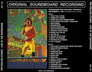 お取り寄せ商品。(ご注文をいただいてから、お取り寄せに3日から1週間お時間をいただきます。) TATOO YOU U.S.ツアー後半戦の’81年12月5日のニューオーリンズ、スーパードーム公演を素晴らしいフルステレオ・サウンドボード・クオリティにて完全収録したものです。 この日の公演はやはりライブ・アルバム用にストーンズ側によってマルチトラック収録されていた日ですが、アルバム「STILL LIFE」には一切使用されず、 ラジオショー音源で「LET IT BLEED」一曲のみが採用されたに留まりました。 しかしながら不採用となった他の演奏曲の中にも出来の良いテイクが多数あり、それらをあのラジオショー・マスターと同じ高音質で楽しむことが出来ます。 ステレオ・サウンドボードのマスターではやや欠落しているショーのオープニングやエンディング部分等のSEパートや、テープチェンジ位置の補填音源にもこれまでの既発盤の ソースとは別ジェネレーションのPA音源を使用して制作されており、マニアの方にはその辺りの細かい違いも興味深く聴いていただけるものと思います。 SUPERDOME NEW ORLEANS LOUISIANA DECEMBER 5, 1981 DISC ONE 01. Take The A Train 02. Under My Thumb 03. When The Whip Comes Down 04. Let's Spend The Night Together 05. Shattered 06. Neighbours 07. Black Limousine 08. Just My Imagination 09. Twenty Flight Rock 10. Going To A Go Go 11. Let Me Go 12. Time Is On My Side 13. Beast Of Burden 14. Waiting On A Friend 15. Let It Bleed DISC TWO 01. You Can't Always Get What You Want 02. Band Introductions 03. Little T&A 04. Tumbling Dice 05. She's So Cold 06. Hang Fire 07. Miss You 08. Honky Tonk Women 09. Brown Sugar 10. Start Me Up 11. Jumping Jack Flash 12. (I Can't Get No) Satisfaction 13. Star Spangled Banner CC01
