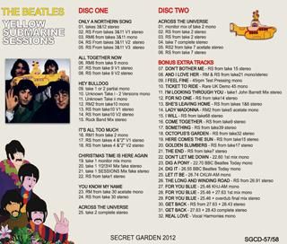 お取り寄せ商品。(ご注文をいただいてから、お取り寄せに3日から1週間お時間をいただきます。) 大好評のビートルズのセッションシリーズ、本作が最終作になる、アルバム『イエ ローサブマリン』関連の音源を集約したタイトルです。このアルバムは同名アニメー ションのサウンドトラックとして製作され、そのB面がジョージ・マーティンによる 映画の挿入音楽であり、A面も2曲「Yellow Submarine」「All You Need Is Love」は 既に『Revolver Sessions』と『Magical Mystery Tour Sessions』にそれぞれ収録さ れており、本作に収録されているのは、それ以外の「Only A Northern Song」「All Together Now」「Hey Bulldog」「It’s All Too Much」がメインになります。さら に、本作には、シングルのみの「You Know My Name」、さらに今までのシリーズで収 録されていなかった「Christmas Time Is Here Again」のセッション音源をそれぞれ 収録しています。これで、ビートルズがレコーディングした全213曲に加え、未発表 曲も含め、すべての楽曲が、このシリーズで網羅されることになります。 「Across The Universe」に関しては、大きく分けて2度に渡ってレコーディングが 行なわれました。同シリーズ『Let It Be Album Sessions』(8CD)に収録されている 「Across The Universe」は、1969年1月の通称ゲットバックセッションにおけるレ コーディングから収録されていました。しかし、本作に収録の「Across The Universe」は、それよりずっと以前の、1968年にアビーロード・スタジオでレコー ディングされたセッションを収録しています。「Lady Madonna」や「The Inner Light」と同じ時期にレコーディングがなされ、当初は『イエローサブマリン』のEP に収録される予定だったということで(この企画は結局とりやめになってしまう)、 レコーディング時期の異なる「Across The Universe」が別途分けて本作に収録され ています。 さらにディスク2は、EXTRA TRACKSとして、今までのSECRET GARDENレーベルからリ リースされたセッション・シリーズから、その後に発掘されたバージョン、抜けが あったバージョンなどを収録しています。 これが、長らく続いたセッション・シリーズの最終作。これで全曲のビートルズの セッション音源で現存するものは網羅しました。本シリーズがあれば、他のものは不用になる決定盤となることでしょう。美しいピクチャー・ディスク仕様の永久保存 がっちりプレス盤。 DISC ONE ONLY A NORTHERN SONG 01. takes 3&12 stereo 02. RS From takes 3&11 V1 stereo 03. RM6 from takes 3&11 mono 04. RS From takes 3&11 V2 stereo 05. RS From takes 3&11 V3 stereo ALL TOGETHER NOW 06. RM6 from take 9 mono 07. RS from take 9 V1 stereo 08. RS from take 9 V2 stereo HEY BULLDOG 09. take 1 or 2 partial mono 10. Unknown Take i - 2 Versions mono 11. Unknown Take ii mono 12. RM2 from take10 mono 13. RS from take10 V1 stereo 14. RS from take10 V2 stereo 15. Rock Band Mix stereo IT’S ALL TOO MUCH 16. RM1 from take 2 mono 17. RS from takes 4 &"2" V1 stereo 18. RS from takes 4 &"2" V2 stereo CHIRISTMAS TIME IS HERE AGAIN 19. take 1 monitor mix mono 20. take 1 1!2!3!4! Mix fake stereo 21. take 1 SESSIONS Mix fake stereo 22. RS from take1 stereo YOU KNOW MY NAME 23. RM from take 30 acetate mono 24. RS from take 30 stereo ACROSS THE UNIVERSE 25. take 2 complete stereo DISC TWO ACROSS THE UNIVERSE 01. monitor mix of take 2 mono 02. RS from take 2 stereo 03. RS from take 2 stereo 04. take 7 complete stereo 05. RS2 from take 7 acetate stereo 06. RS from take 7 stereo BONUS EXTRA TRACKS 07. DON’T BOTHER ME - RS from take 15 stereo 08. AND I LOVE HER - RM & RS from take21 mono/stereo 09. I FEEL FINE - 45rpm Test Pressing mono 10. TICKET TO RIDE - Rare UK Demo 45 mono 11. I’M LOOKING THROUGH YOU - take1 John Barrett Mix stereo 12. FOR NO ONE - RS from take14 stereo 13. SHE’S LEAVING HOME - RS from takes 1&6 stereo 14. LADY MADONNA - RM2 from take5 acetate mono 15. I WILL - RS from take68 stereo 16. COME TOGETHER - RS from take9 stereo 17. SOMETHING - RS from take39 stereo 18. OCTOPUS’S GARDEN - RS from take32 stereo 19. HERE COMES THE SUN - RS from take15 stereo 20. GOLDEN SLUMBERS - RS from take17 stereo 21. THE END - RS from take7 stereo 22. DON’T LET ME DOWN - 22.60 1st mix mono 23. DIG A PONY - 22.70 BBC Beatles Today mono 24. DIG IT - 26.55 BBC Beatles Today mono 25. LET IT BE - 26.74 CKLW-AM mono 26. THE LONG AND WINDING ROAD - RS from 26.91 stereo 27. FOR YOU BLUE - 25.46 KHJ-AM mono 28. FOR YOU BLUE - 25.46 + 27.63 1st mix mono 29. FOR YOU BLUE - 25.46 + overdub final mix stereo 30. GET BACK - RS from 27.63 + 28.43 stereo 31. GET BACK - 27.63 + 28.43 complete stereo 32. REAL LOVE - Vocal Harmonies mono CC01
